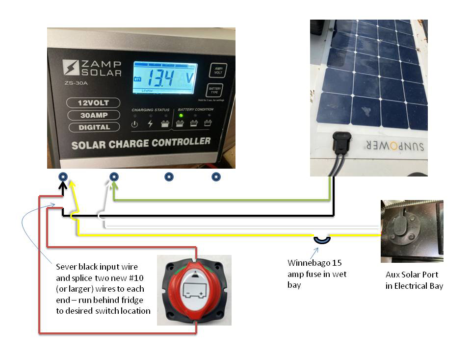 3 – If you have an earlier model View or Navion, it is possible that the installation of a solar disconnect switch might be equally straightforward. The website link below will take you to a View / Navion website that details an installation that appears to have to deal with only the wires shown in the Zamp installation diagram above. And on earlier models there might be some slack available in the cabinet as well!