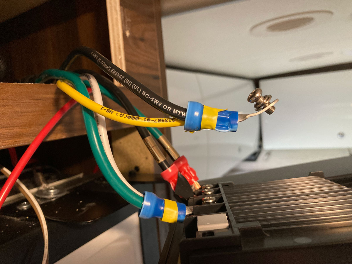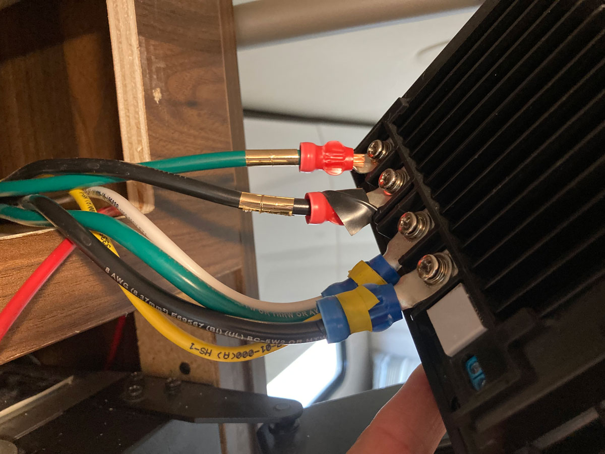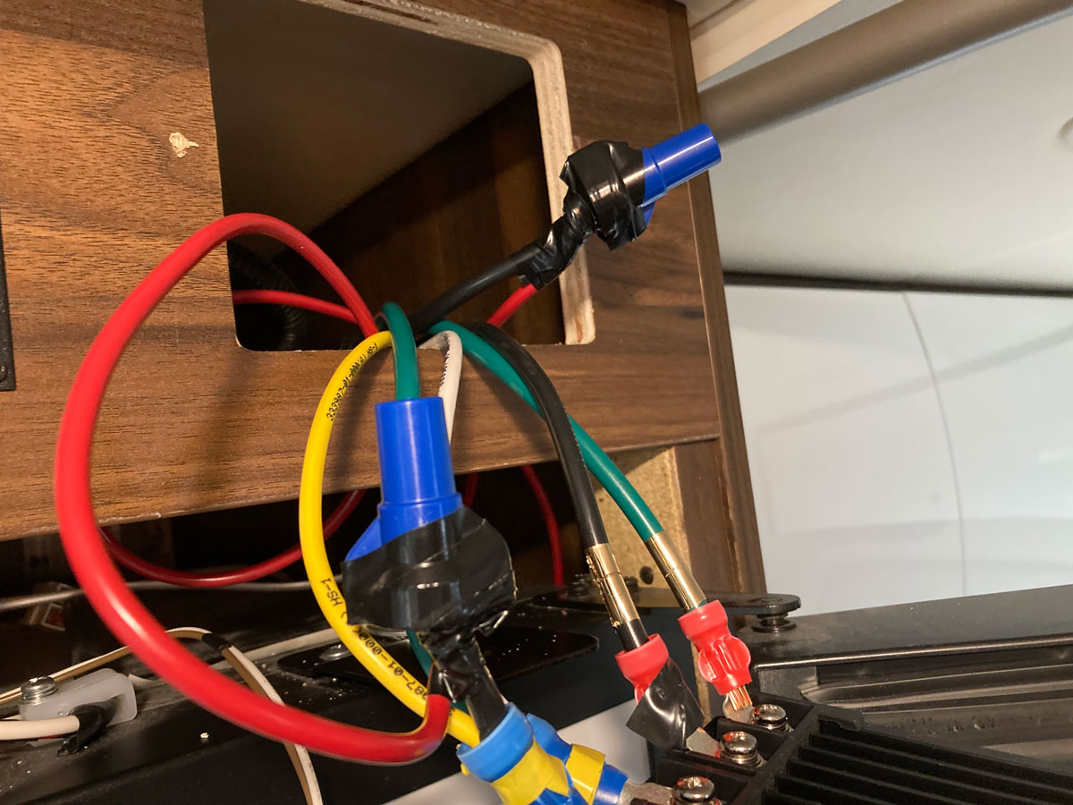 Once I had the two new red wires running from the Truma area to the top of the fridge, I cut the black Zamp # 8 solar input wire and proceeded to splice each red # 10 wire to each end of the severed solar input wire. Due to the size of the wires concerned (a # 8 and a # 10 splice), this was a bit awkward. Ideally I would have liked to use splice connectors that a pro would have been proud of, but I couldn’t find a handy source locally that made this practical. I resorted to using wire nuts, even though I knew that RV professionals frown on this method due to the possibility of the wire nut backing off during potential road vibration. However, I did some research online and was eventually comforted by the technique this video gave me: