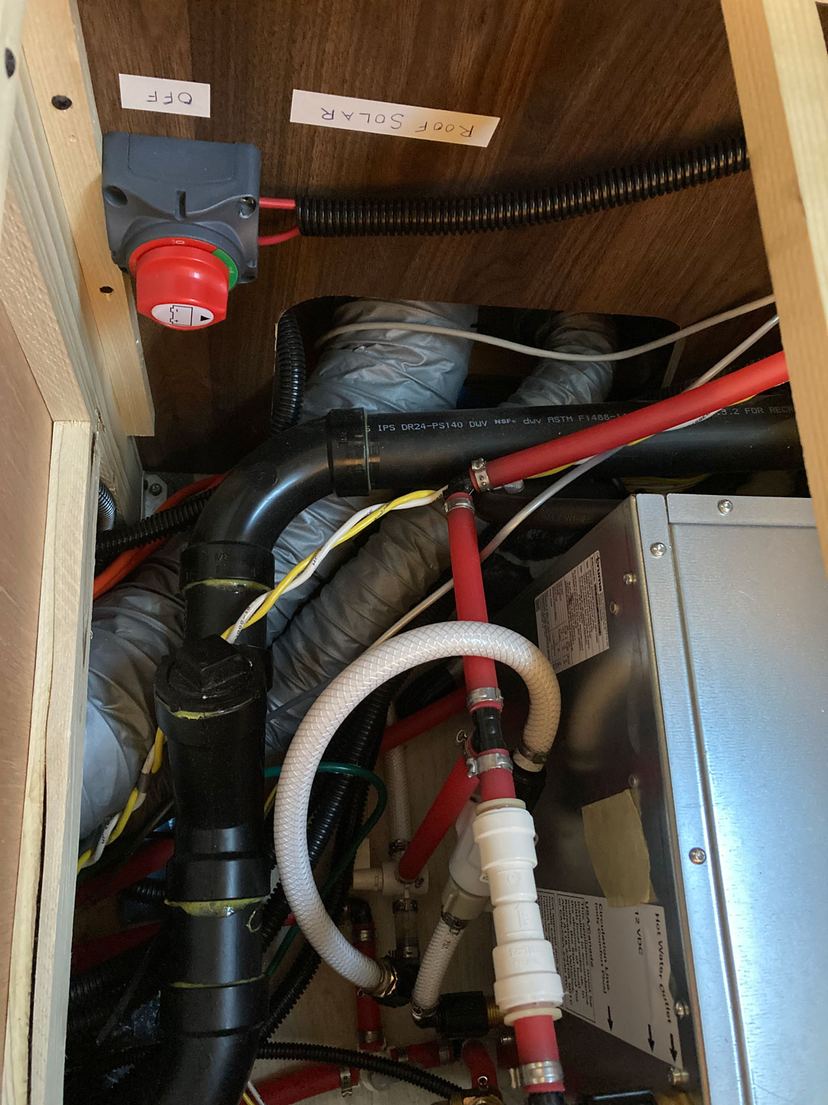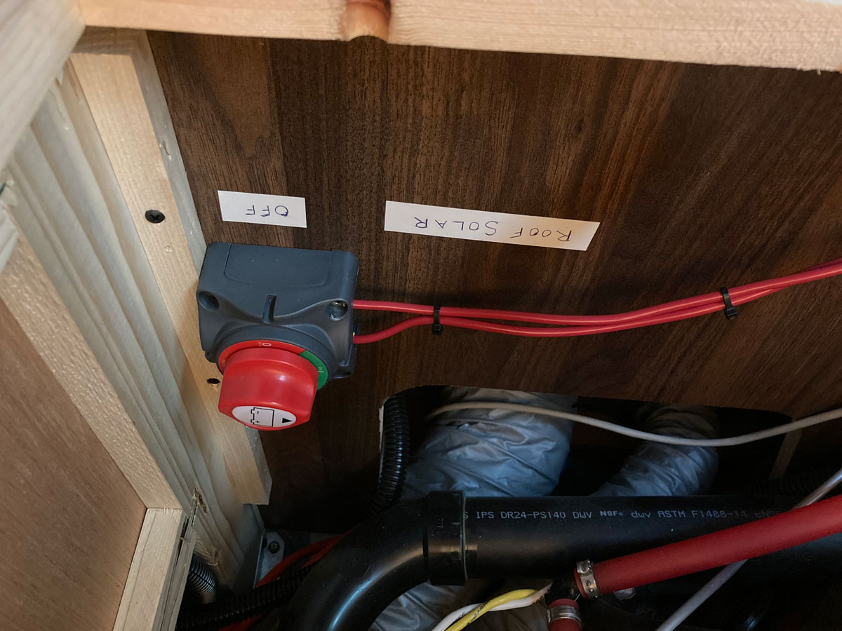I decided that “better way” was to install an in-coach switch in the power line coming from the roof. There isn’t a good looking place to install the switch beside the solar controller, so it is hidden under the bed near the Truma hot water heater.