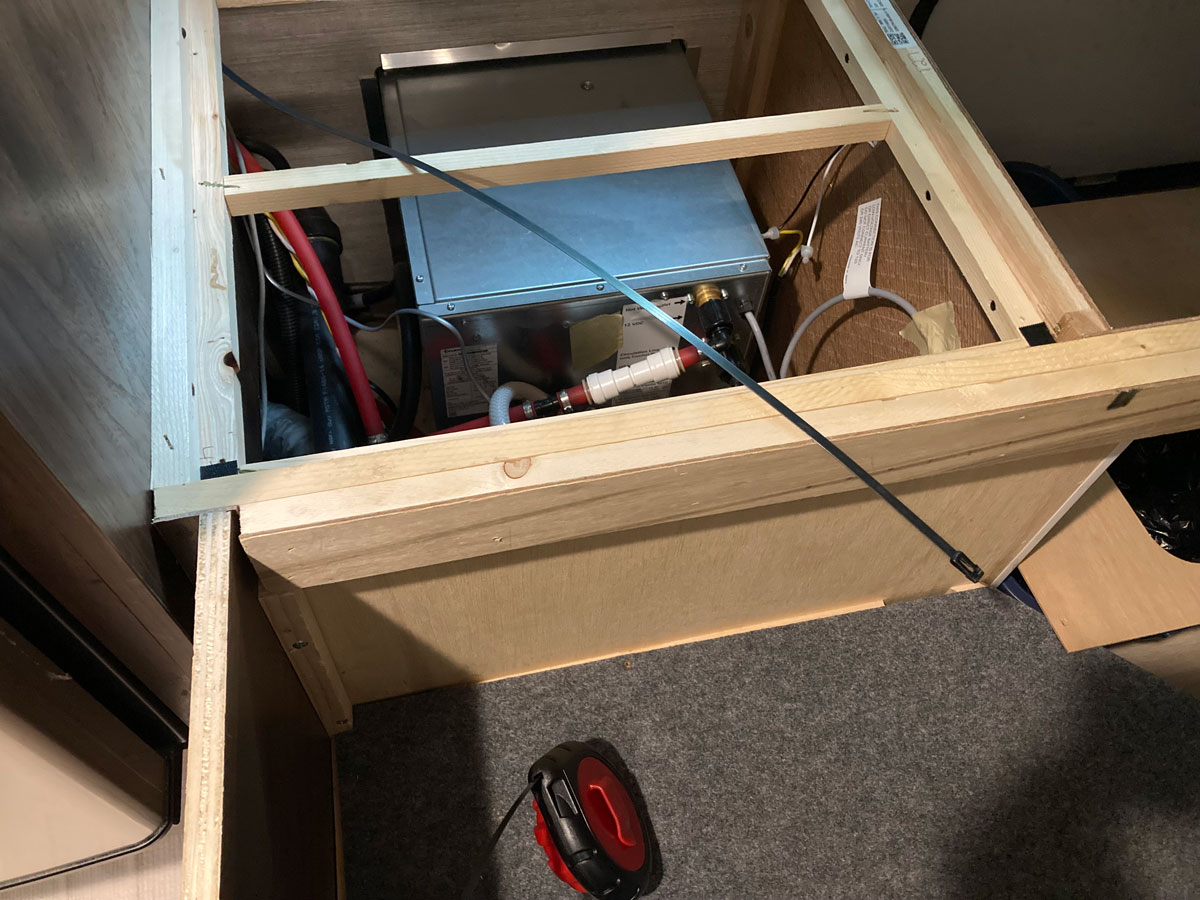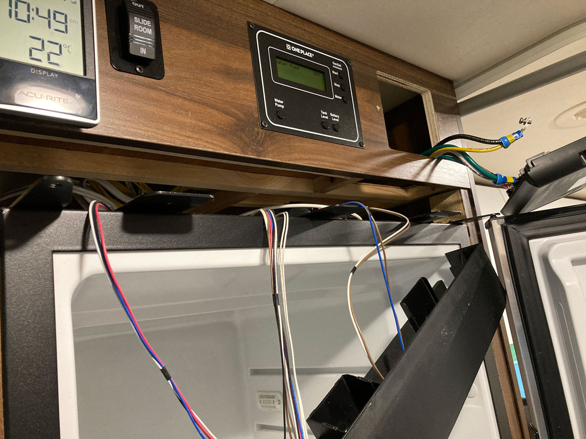 The other wires involved were new, and I needed about 15’ of red # 10 wire to run a tandem set from the area of the Zamp controller down to the Truma area. As with previous mods, I removed the control panel from the top of the fridge to provide easy access to the back wall allowing me to drop an electrian’s cable snake down the rear of the fridge and into the Truma area. I found that inserting the cable snake at the right rear of the fridge only required a few tries to make it to the bottom and out to the water heater.